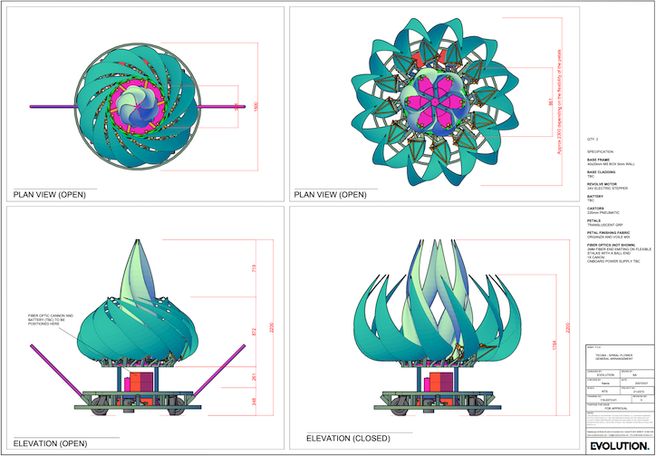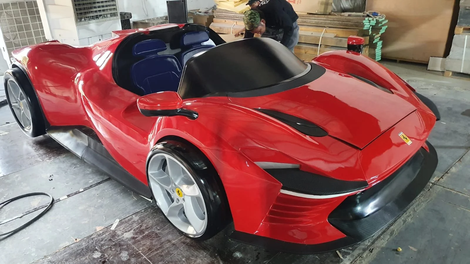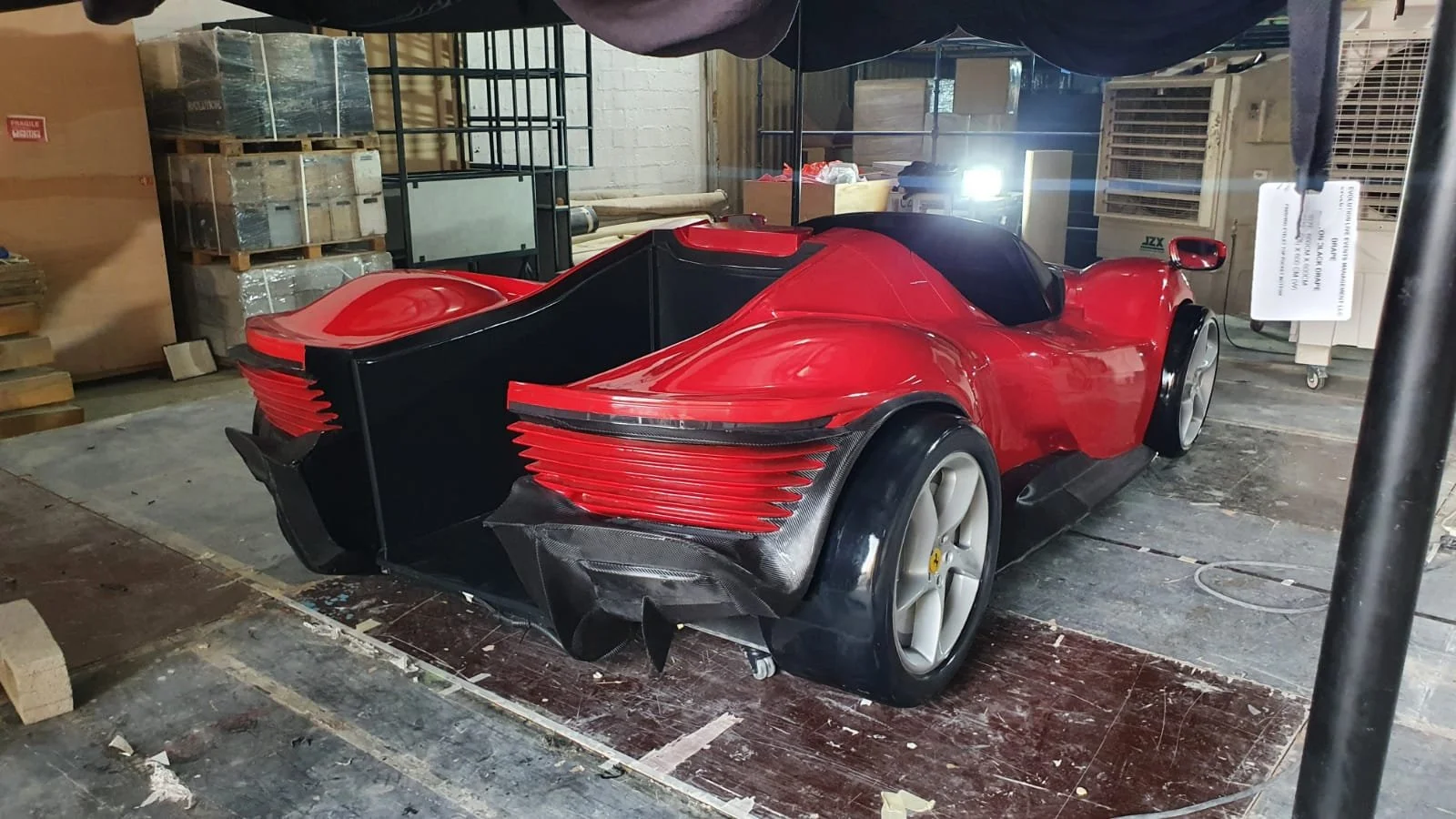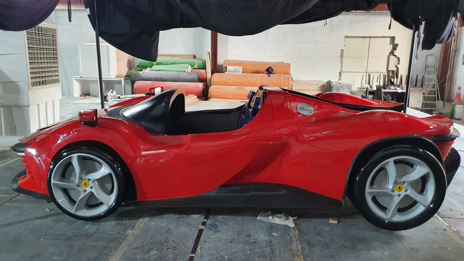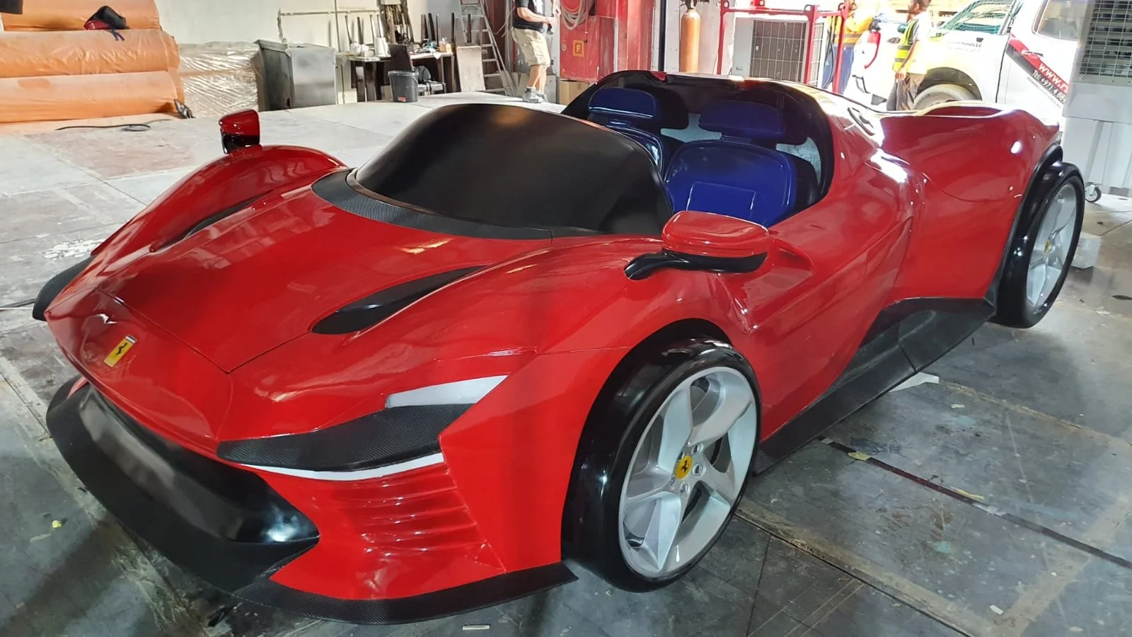 Stylised Ferrari Daytona SP3. Self propelled and automated to run on show control, with RF trackers, object recognition and automated safety cutoff/reset. Body produced on 5-axis milling machine and hand finished in fiber glass. Approved by Ferrari Design Dept. Maranello.