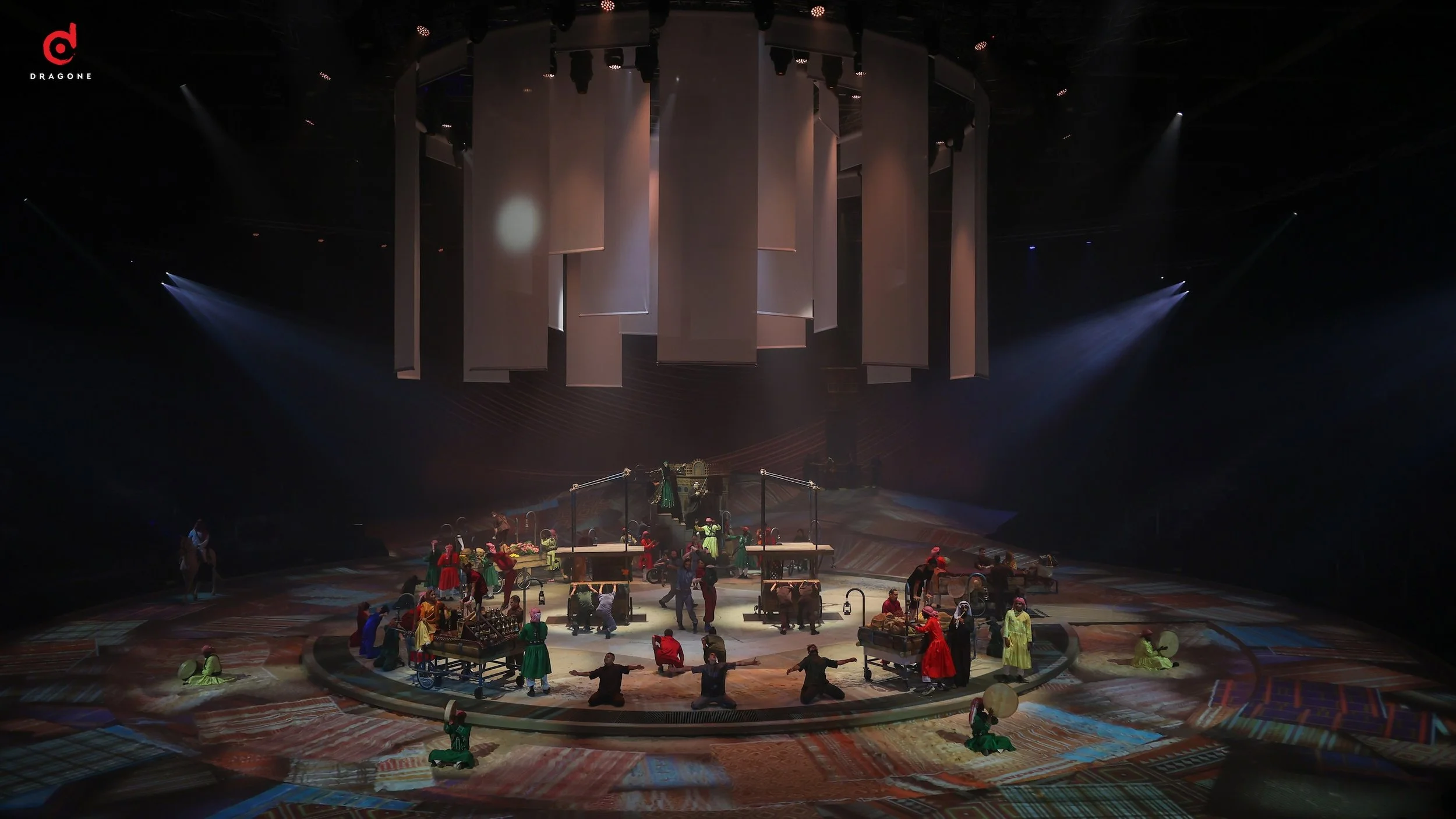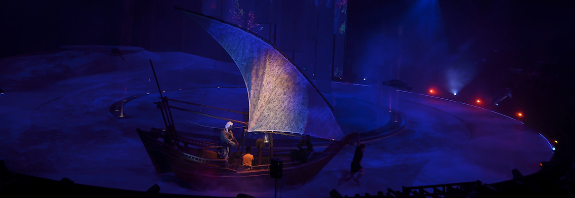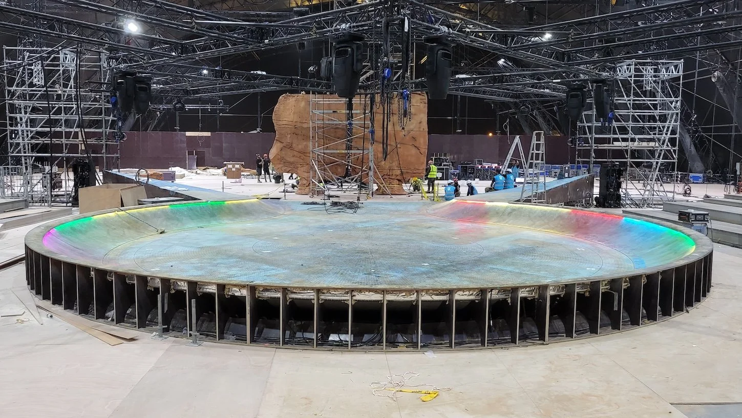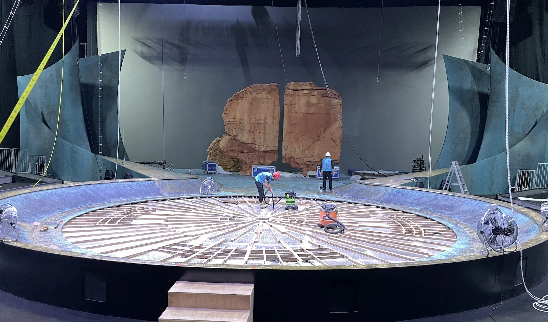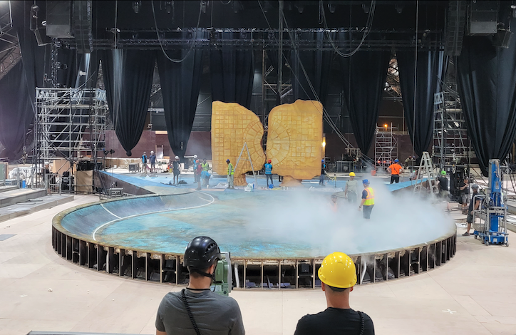 Stage & Scenic design, production & delivery. “wet” stage with rapid filling and draining capability. Low fog and programable LED lighting integrated into stage rim. 3D sculpted wings Giant rotating monoliths plus all stage drapes and backdrop.