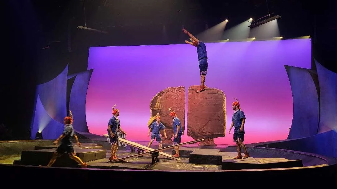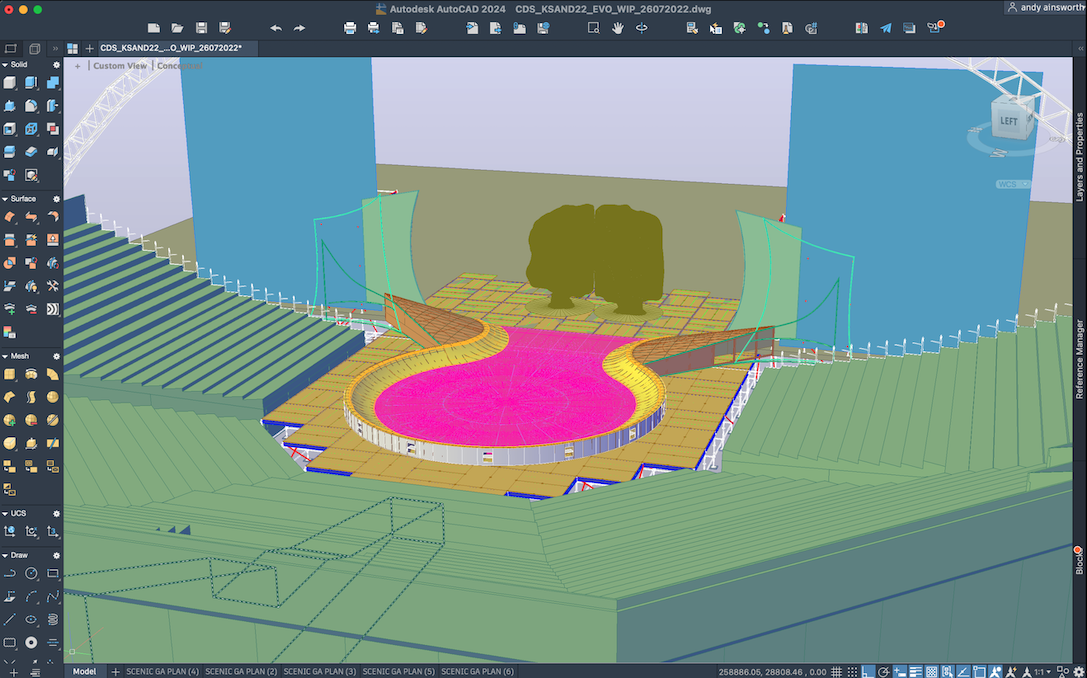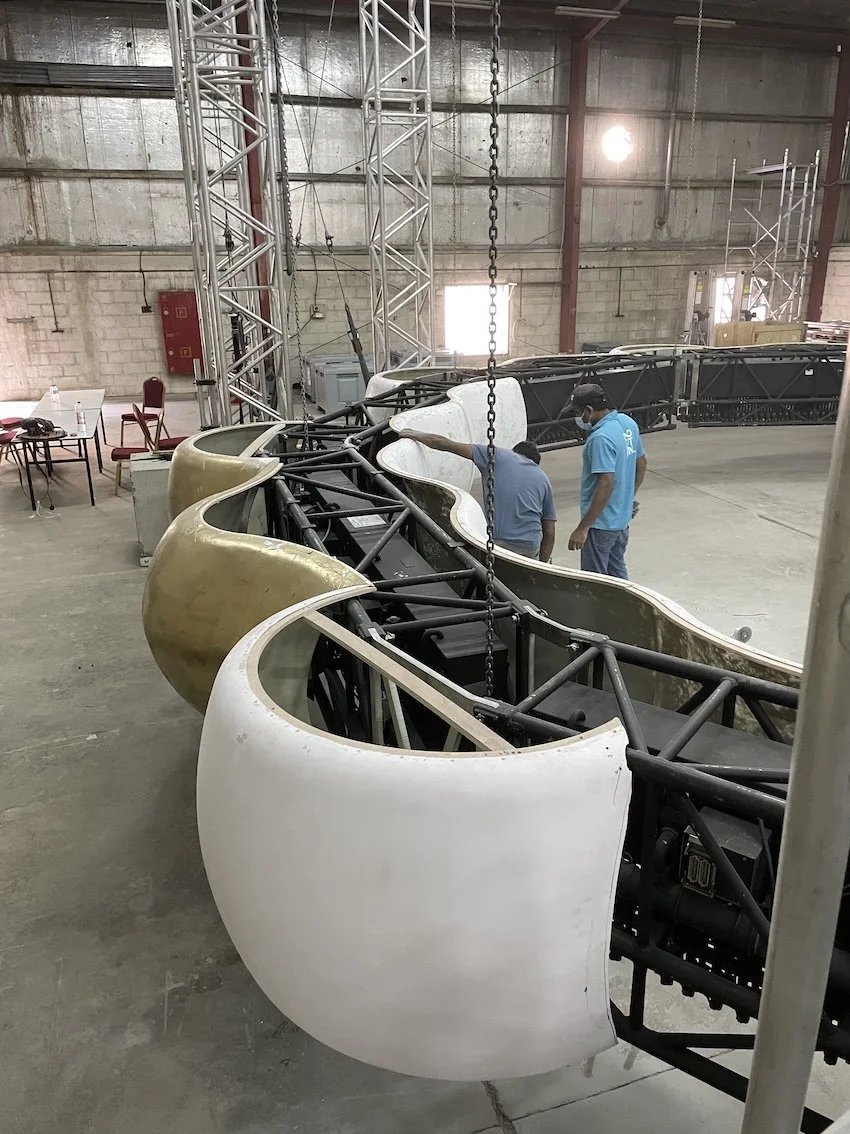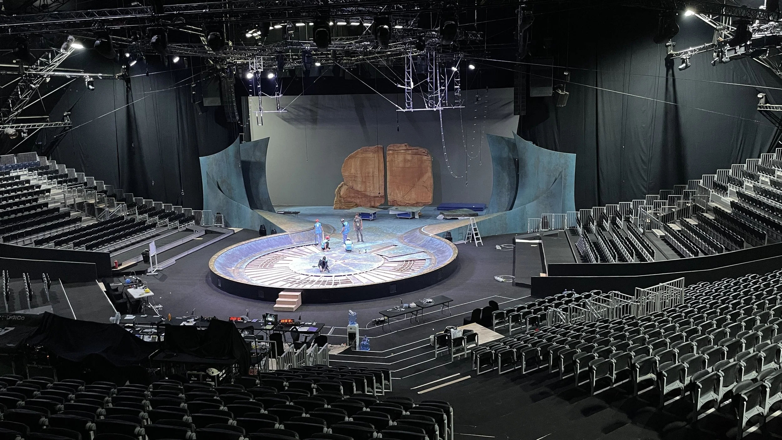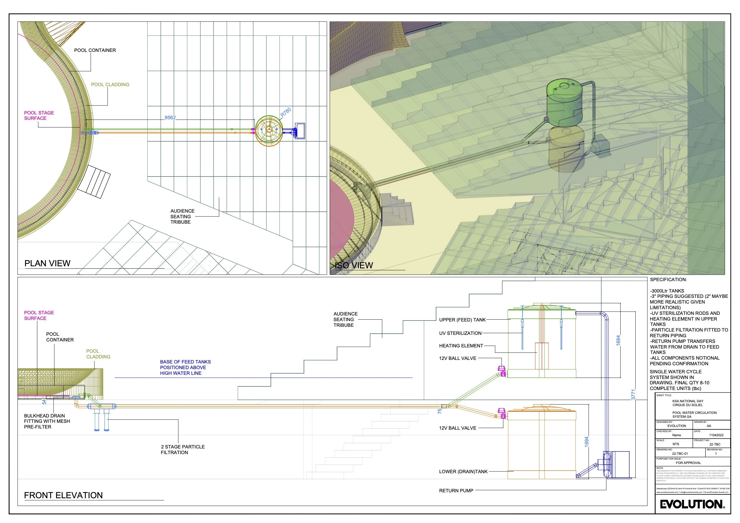 Stage & Scenic design, production & delivery. “wet” stage with rapid filling and draining capability. Low fog and programable LED lighting integrated into stage rim. 3D sculpted wings Giant rotating monoliths plus all stage drapes and backdrop.