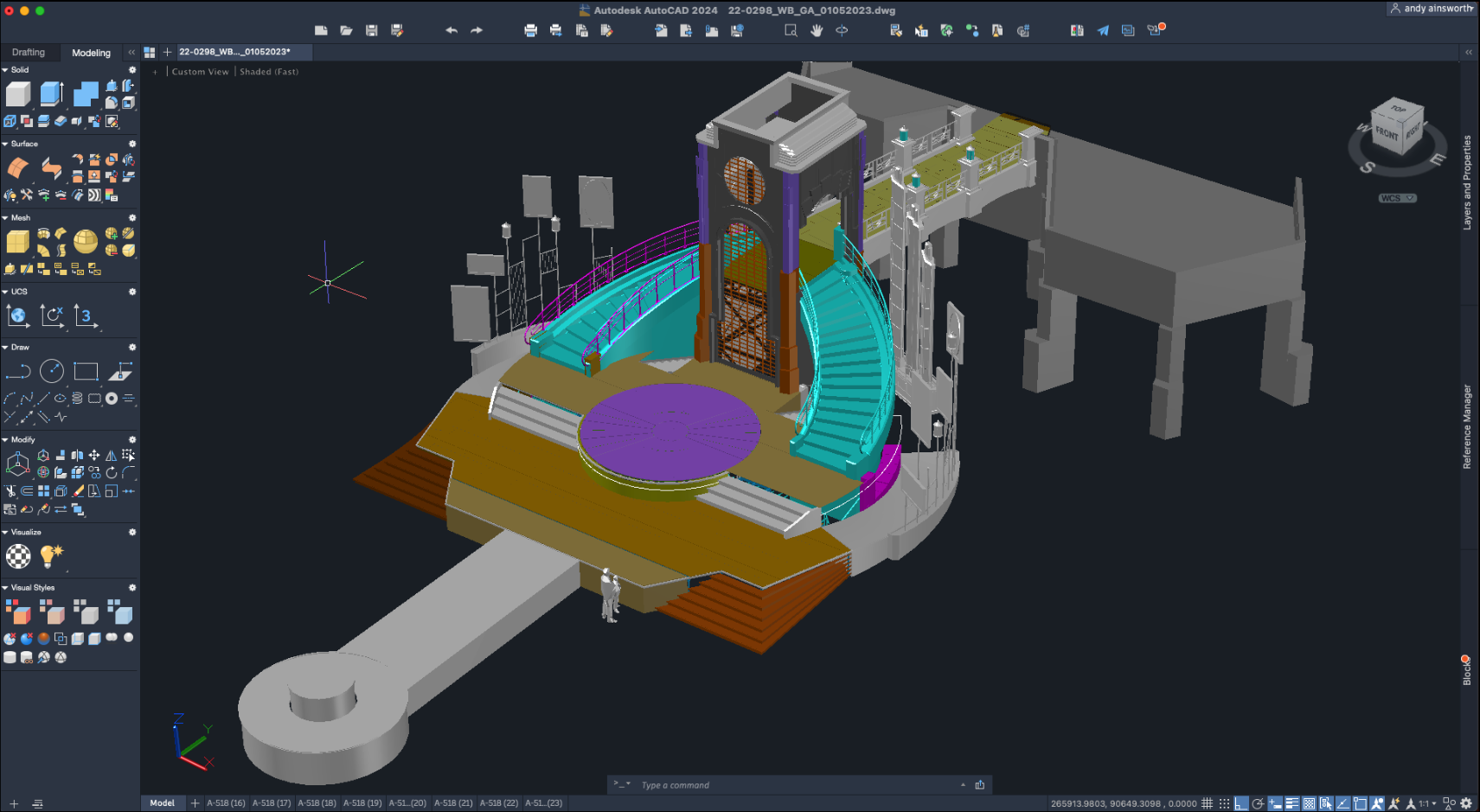 Multi-level main stage integrated into existing theme park venue. 14m high central tower with twin sweeping stair cases and video wall facade. 10m span bridge linking to venue 1st floor. Modular forestage, catwals and B-satge with lazy suzan and 2ton lift. IntegratedWRGB pixel controlled cove lighting throughout. Integrated AV and VFX