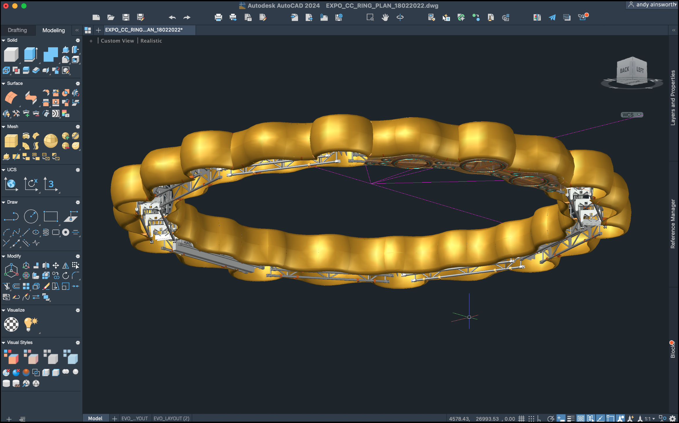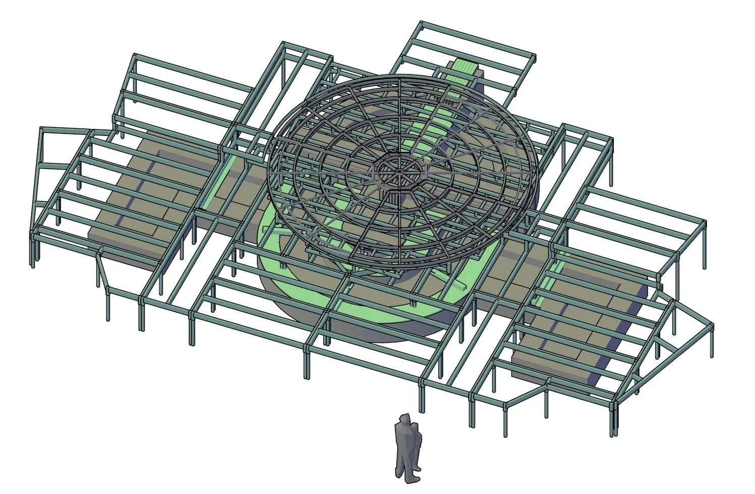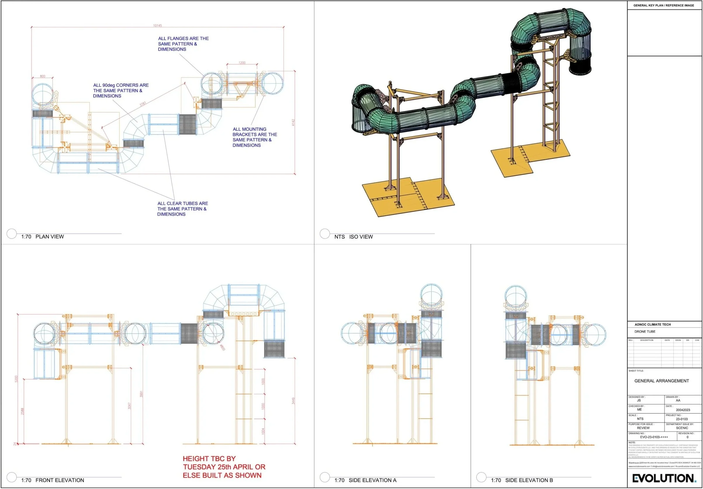 Laser CNC’d structure with custom fabricated ducting brackets and calibrated weighted base plates. Clear and mesh ducting sections allow audience view of drone action.