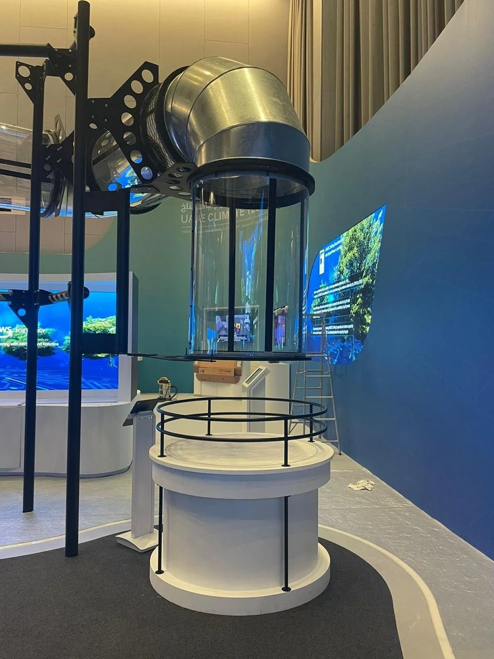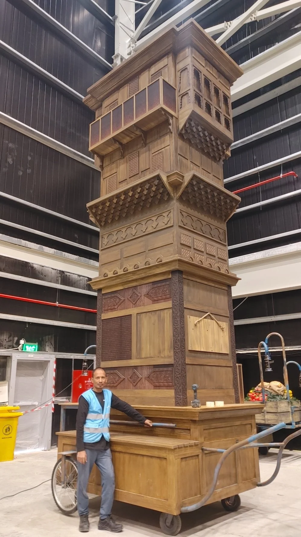 Internally illuminated mashrabiya tower with cantilever spiral staircase able to support dynamic load of up to 10 acrobatic performers.