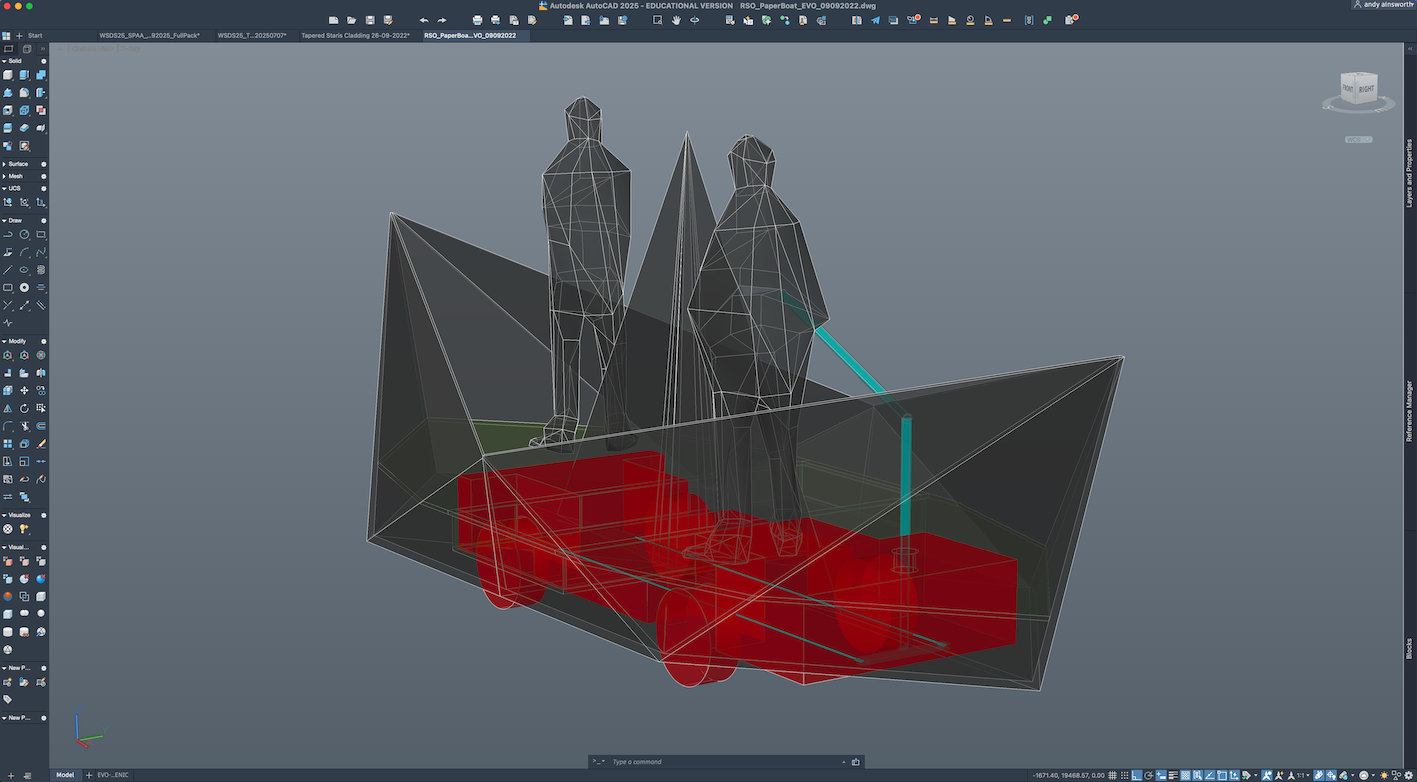 Self propelled “paper boat” suitable for outdoor use. Capable of manoeuvring up and down ramps and around the stage.
